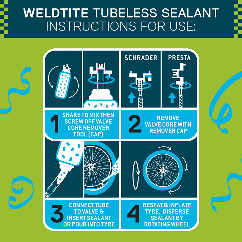 Sellador Tubeless Weldtite. Ahora con Rubber Shred para una protección óptima contra pinchazos.