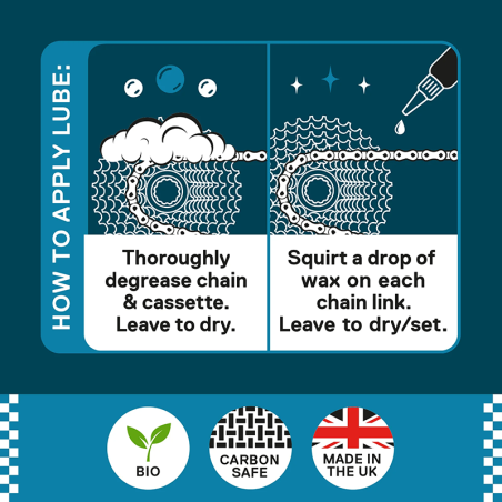 Modo de uso: Desengrasar bien la cadena y el cassette. Dejar secar. Agitar bien, aplicar una gota de cera en cada eslabón de la cadena. Dejar secar. Para recorridos de más de 300 km, una vez seco, aplicar una segunda gota en cada eslabón de la cadena y dejar secar.