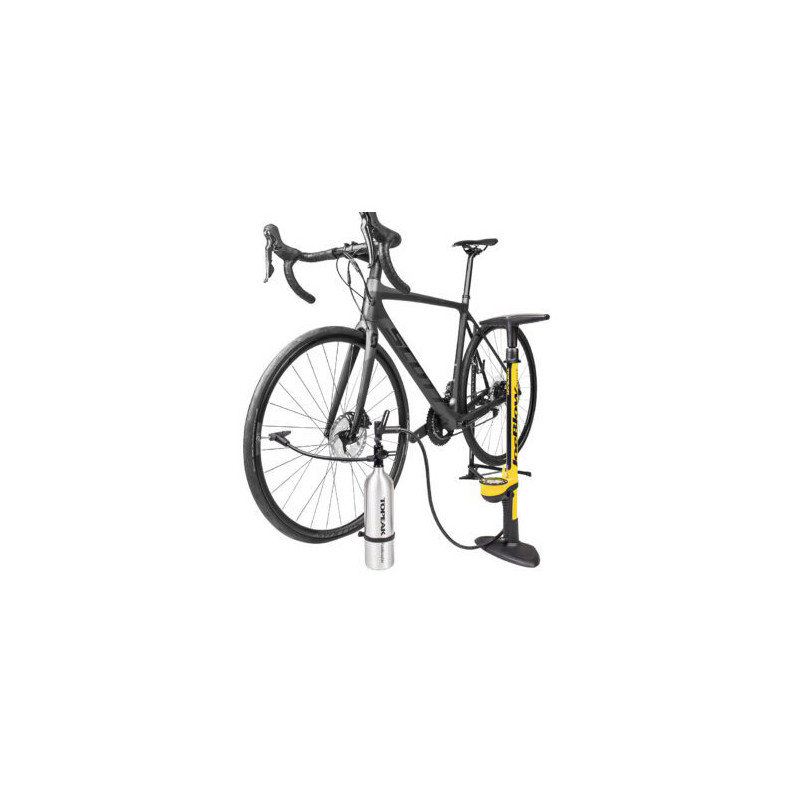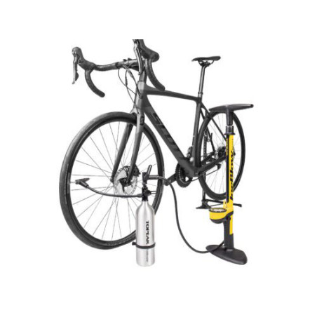 Tanque de aire de aluminio con cabeza infladora y un volumen de 1 litro, que puede ser inflado con cualquier bomba convencional de pie hasta 200 psi / 14 bar para un rápido y particularmente fácil inflado y sellado de neumáticos sin cámara. En cuanto la palanca de selección de modo se mueve de "CARGAR" a "INFLAR", el aire comprimido del tanque de aire fluye hacia el neumático, cuya presión de aire puede ser inmediatamente ajustada perfectamente con la bomba de pie conectada. El tubo integrado y flexible con cabeza de bomba es compatible con las válvulas Presta y Schrader y alivia el vástago de la válvula durante su uso.