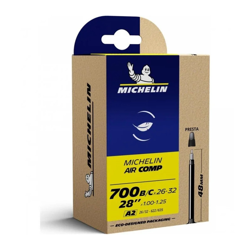 La Michelin AirComp A2 Ultralight es la cámara de aire de butilo más ligera de la gama. En todas las dimensiones, la cámara de aire de competición ofrece una buena protección contra los pinchazos, un peso mínimo y una muy buena relación calidad-precio.
