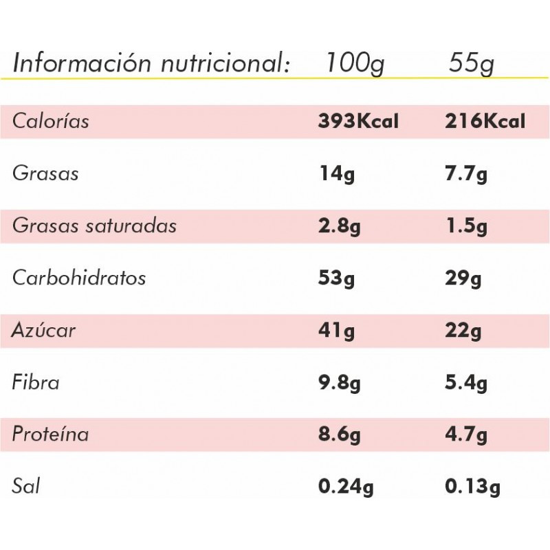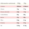 La barrita contiene cafeína (182 mg/100 g) - no apta para niños, mujeres embarazadas o en periodo de lactancia. Ingredientes: dátiles 47,5%, anacardos 30%, pasas 16%, cacao desgrasado 6%, extracto de guaraná 0,83%, aroma, cacahuetes . Puede contener trazas de cáscaras, semillas, otros frutos secos, sésamo, leche y soja.