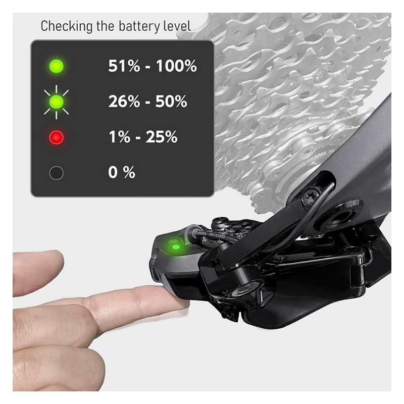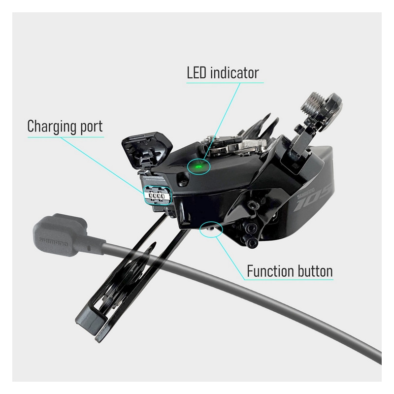 Cambio ancho Di2 de 12 velocidades compatible con 36D Al recibir la señal de cambio inalámbrica de la maneta de cambio, el cambio SHIMANO 105 completa un cambio en un abrir y cerrar de ojos con su motor de alto rendimiento y su estructura de eslabones optimizada. Este es el centro del sistema Di2, con el puerto de carga, los indicadores LED, los interruptores de ajuste y mucho más integrado en un paquete compacto. Un diseño de perfil bajo reduce los daños por contacto y caídas.