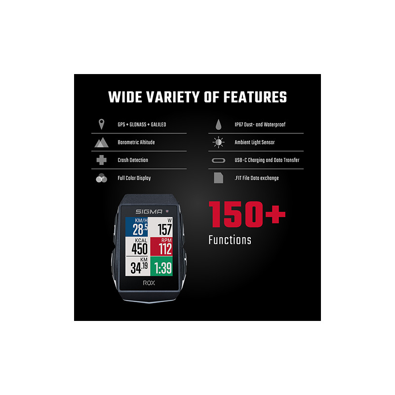 El ROX 11.1 EVO es el compañero perfecto para cualquier propósito. Más de 150 funciones hacen que encontremos en él todo lo que necesitamos. La velocidad y la distancia a través de GPS, el registro del altímetro y la navegación con tracks o con komoot son parte de su funcionalidad. La conectividad con e-bikes y rodillos inteligentes está garantizada. Su pantalla a color totalmente personalizable proporciona un acceso instantáneo y fácil de leer a todos los datos y gráficas. Su diseño deportivo, versatilidad y facilidad de uso hacen que el ROX 11.1 EVO esté llamado a ser un referente. Los cinco botones de control sorprendentemente grandes responden en todas las condiciones climáticas, incluso con guantes. Las múltiples opciones de la app gratuita SIGMA RIDE permiten intercambiar resultados y éxitos con compañeros de ruta y compañeros de equipo con un simple "toque de pantalla".