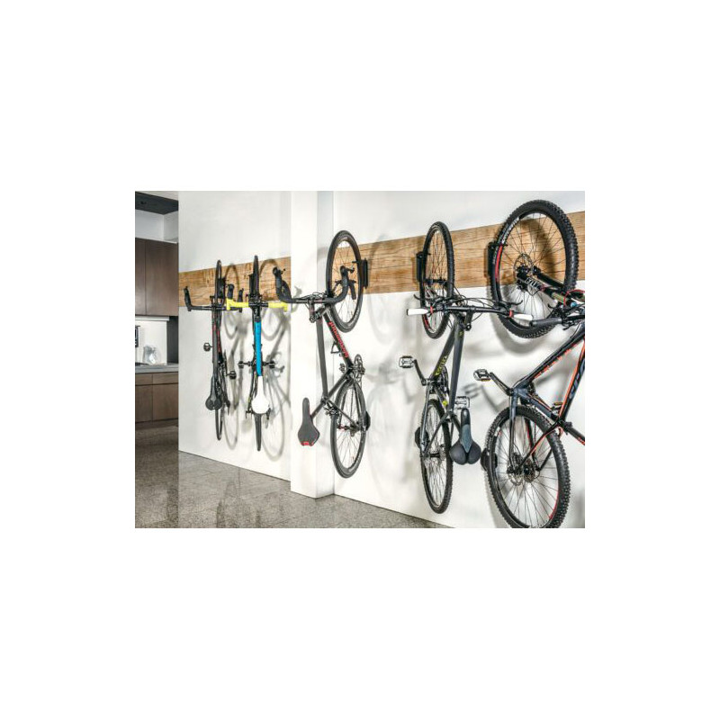 Una solución para el almacenamiento muy económica y compacta para optimizar el espacio. Permite girar la bicicleta a ambos lados y es compatibles con combinaciones de ruedas y neumáticos de 8 cm de altura y 2.35" de ancho.