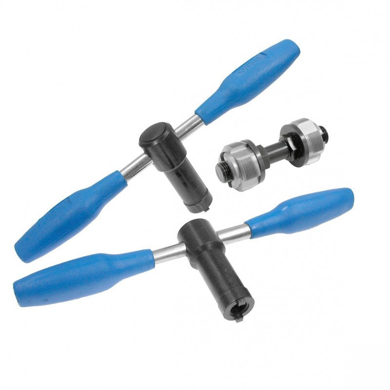 Atornille ambos lados de la herramienta en la caja de pedalier al mismo tiempo para evitar que se desvíe y, por tanto, que se dañe la rosca existente.