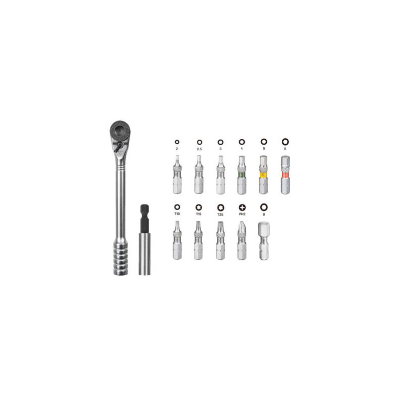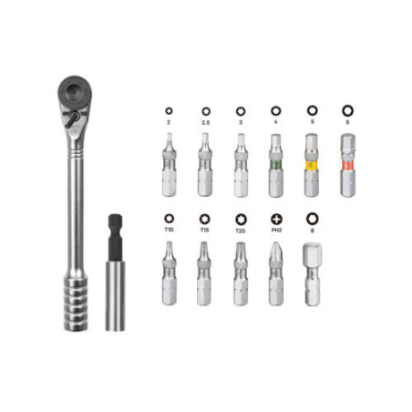 Una versión mejorada del juego de herramientas de carraca que admite hasta 60 Nm. En comparación con las herramientas de carraca estándar, puede realizar una gama más amplia de tareas de mantenimiento.