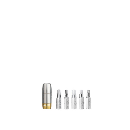 Este set de herramientas incluye un Torq Socket con valor de 5Nm que funciona con cualquier herramienta que disponga de una llave Allen de 5 mm. Tiene un límite para no sobrepasar los valores recomendados y así no dañar ninguno de los tornillos, componentes o partes de carbono.