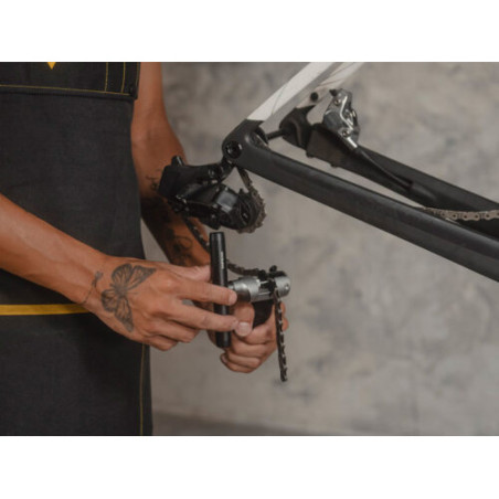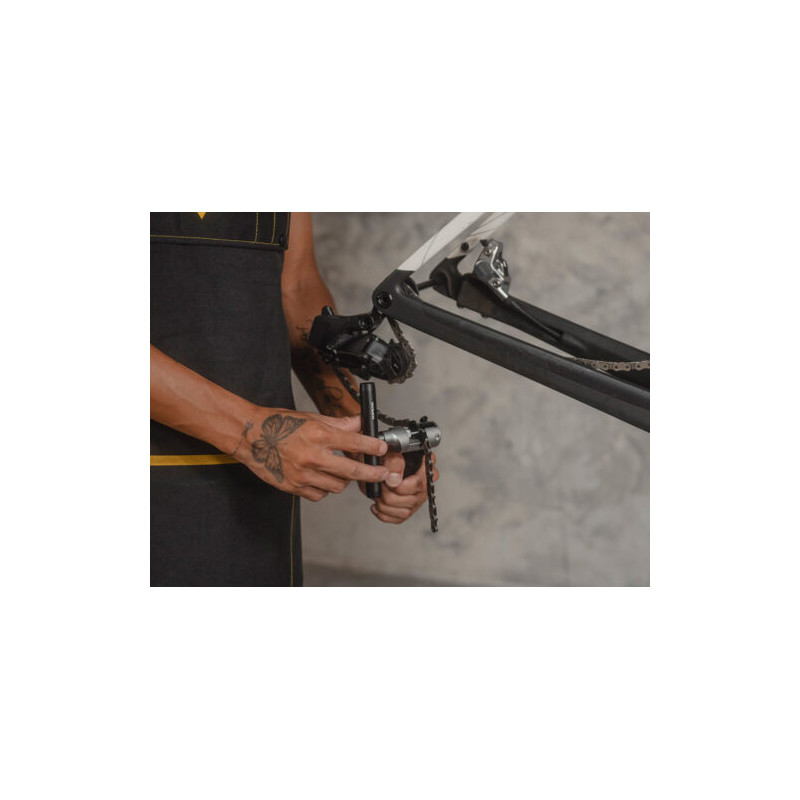 Herramienta de precisión para cadenas profesionales con un diseño único de alineación rápida de cadenas. Garantiza la compatibilidad con cadenas de pasador hueco de 13 velocidades Shimano®, SRAM® y Campagnolo®, satisfaciendo las exigentes demandas de los entusiastas del ciclismo y los mecánicos profesionales.