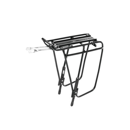 Para ruedas de 24"-29" y 700C. Portaequipajes trasero tubular de aluminio de talla única equipado con patas ajustables para adaptarse a la mayoría de las ruedas de 24" a 29" MTB y bicicletas de paseo 700C. Portaequipajes muy resistente diseñado para recorridos de larga distancia. La barra lateral integrada proporciona un punto de fijación de alforjas en la parte inferior que permite más espacio para carga en la parte superior del portaequipajes. La placa MTX QuickTrack® es compatible con cualquier Topeak MTX TrunkBag, cesta trasera MTX y con la mayoría de los portaequipajes y alforjas del mercado.