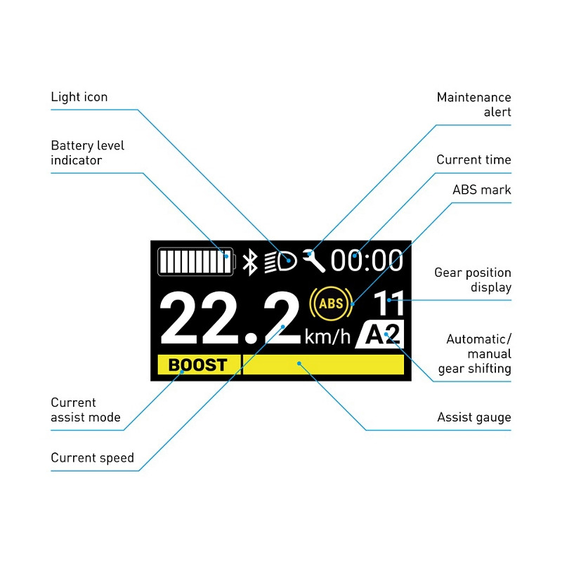 ·Los paneles de datos personalizables te permiten seleccionar cuatro parámetros de conducción por pantalla con la APP E-TUBE PROJECT