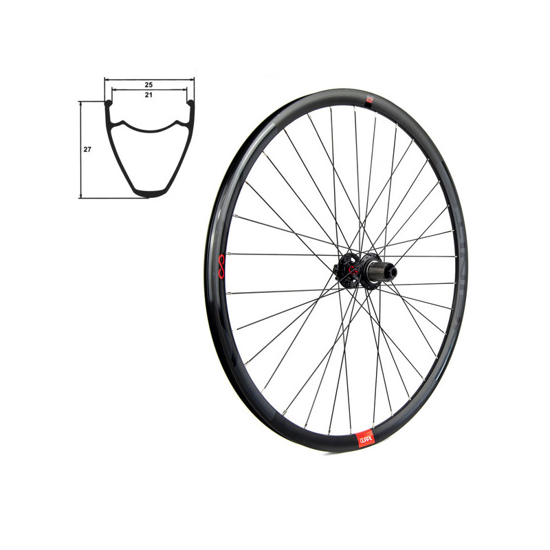 -Llanta INFINITE Tubeless Ready con perfil interior de 21mm, exterior de 25mm y altura de 27mm.